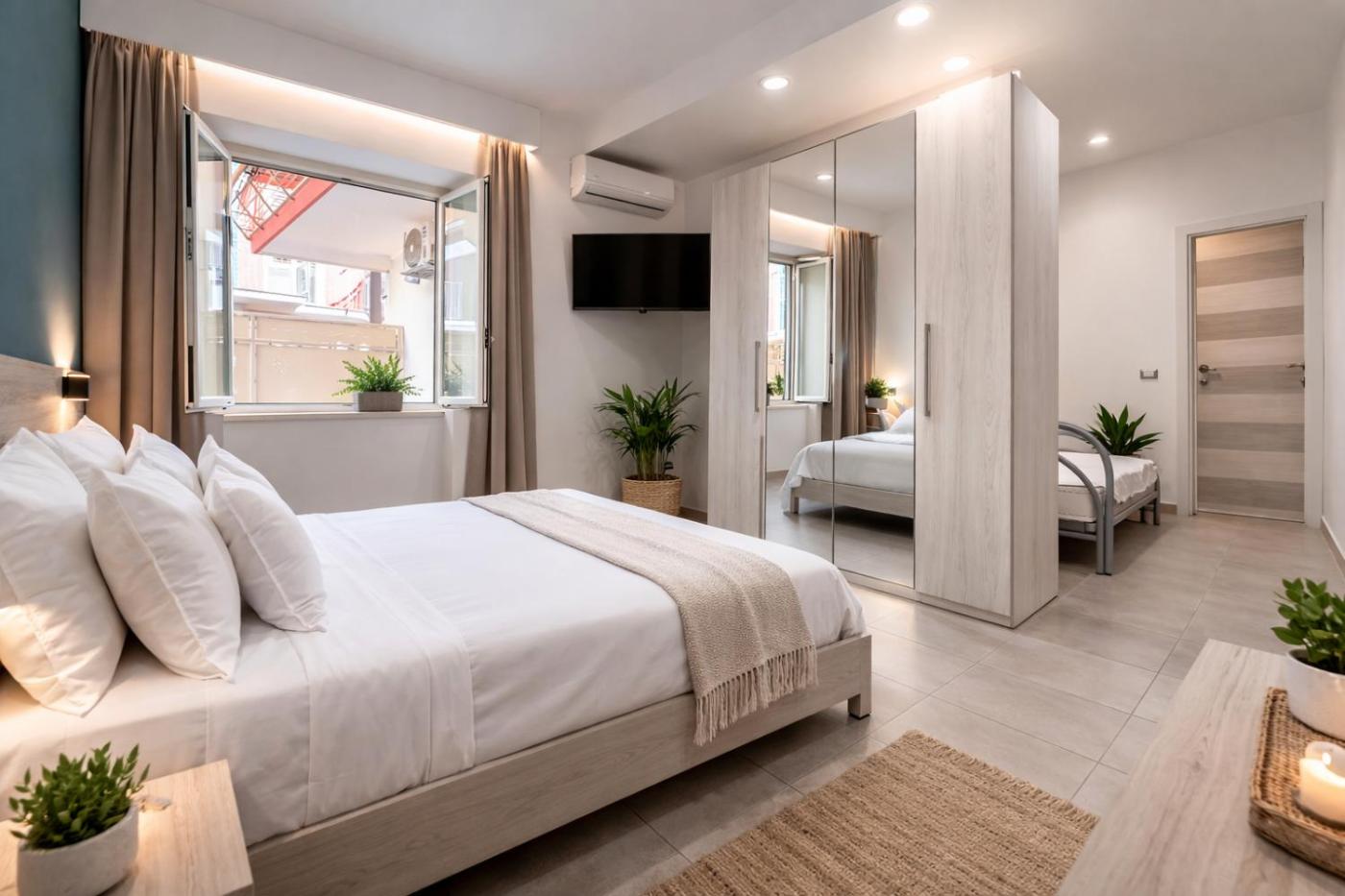 Camera Tripla. Spaziosa camera tripla climatizzata e insonorizzata dotata di bagno privato con doccia e bidet. L’alloggio dispone di 2 letti.